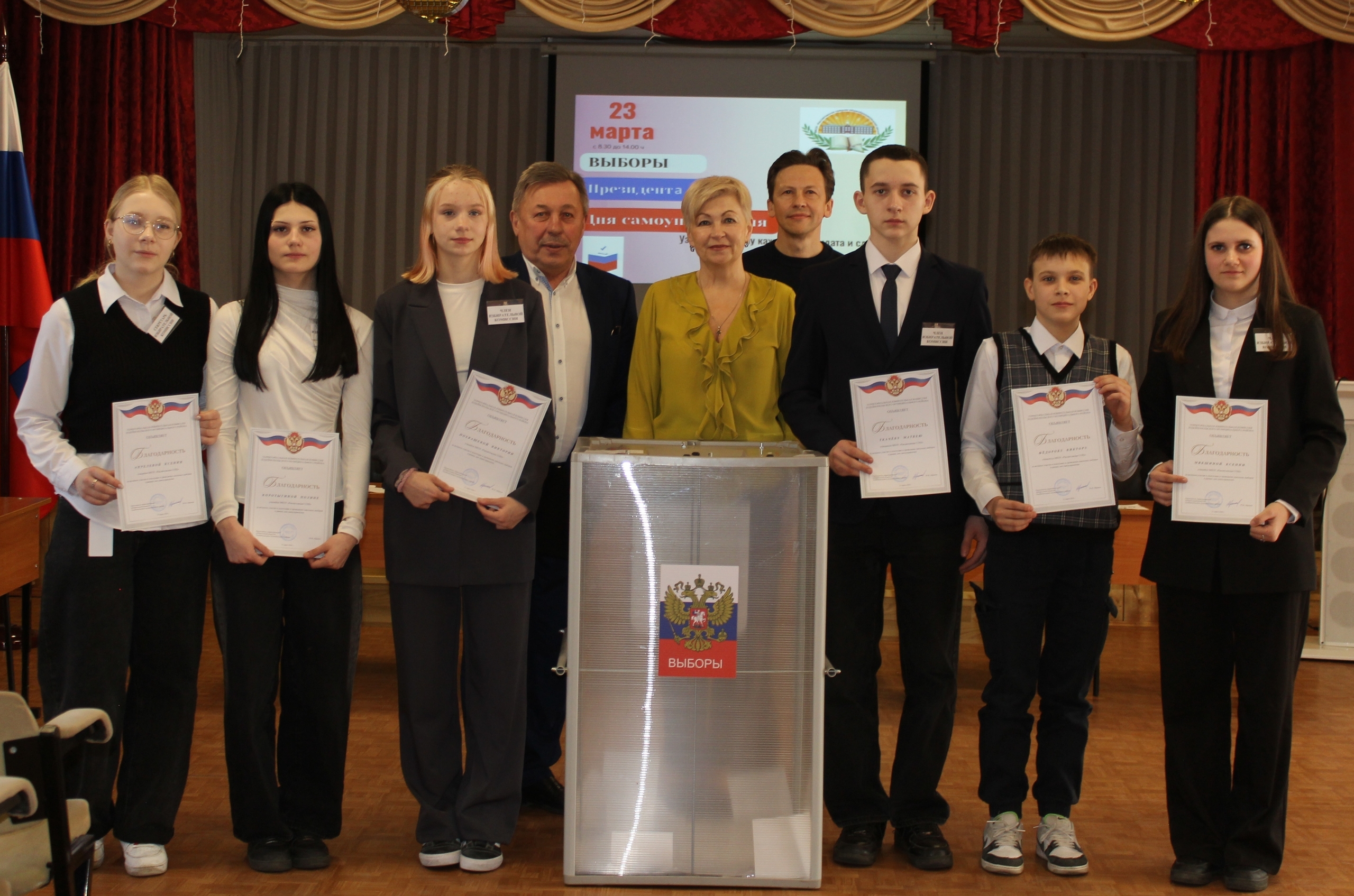 За активное участие в подготовке и проведении выборов благодарности Территориальной избирательной комиссии Лодейнопольского района были вручены отличившимся ученикам. Торжественную церемонию награждения провел председатель территориальной комиссии Юрий Владимирович Абрамов.